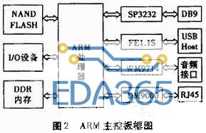 arm处理器主控板硬件采用ac97接口与音频处理芯片wm9714相连,实现话音采集与播放控制。arm处理器主控板通过sp3232芯片,将串口ttl电平转化为rs232电平,以实现串口通信;通过fe1.1s芯片扩展4个usb host接口,支持u盘、鼠标、键盘、蓝牙等usb设备;通过以太网控制芯片dm9000ae实现网络数据传输与控制;通过i/o口与显示屏、旋转开关和指示灯等设备直接相连。